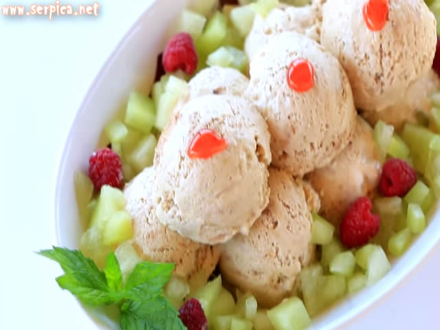 Poslužite uz komadiće sveže dinje, prelivom od malina i ako imate i koju svežu malinu bilo bi savršeno. Uživajte u divnom sladoledu ovog leta. Prijatno!