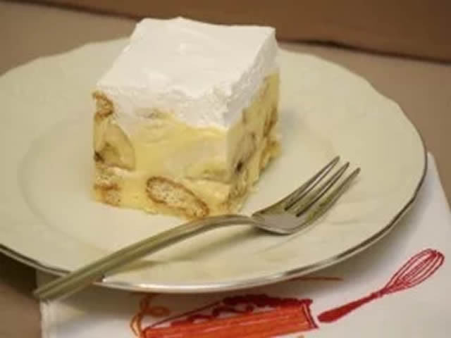 POTREBNO: 300 g plazma keksa (ili petit beure keksa), 3 pudinga od vanilije, 9 žlica šećera, 1l mlijeka, 200 g maslaca, 4 žlice kiselog vrhnja, 4-5 banana, 200 ml slatkog vrhnja za šlag.