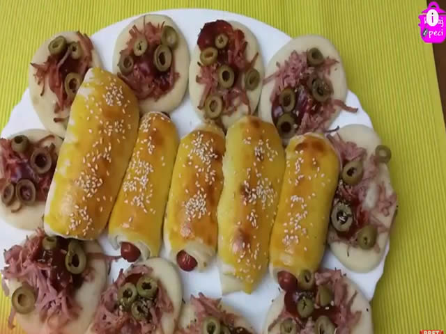 Potrebno je: univerzalno tijesto, nadjev po želji ( skuhane viršle, salama, masline ), kečap, origano, susam, ulje.