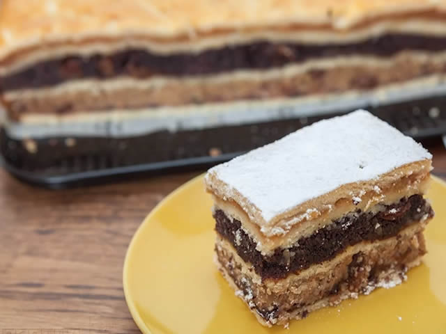 Rastanjiti drugo testo. Staviti preko nadeva od oraha, premazati ostatkom pekmeza i ravnomerno rasporediti nadev od maka.