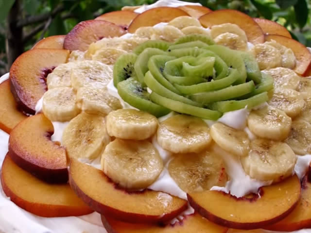 Sastojci: 4 belanca, 200g šećera, kašičica vanilinog ekstrakta, kašičica sirćeta, 1/2 kašike gustina, slatka pavlaka, voće po želji.