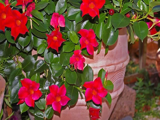 Mandevila ili Brazilski jasmin će razviti spektakularne, često mirisne cvetove u toplim klimatskim uslovima. Cvetovi dolaze u različitim bojama, uključujući belu, roze, žutu i crvenu. Mnogi hibridi koji su razvijeni uglavnom proizilaze iz M. × Amabilis, M. splendens i M sanderi.