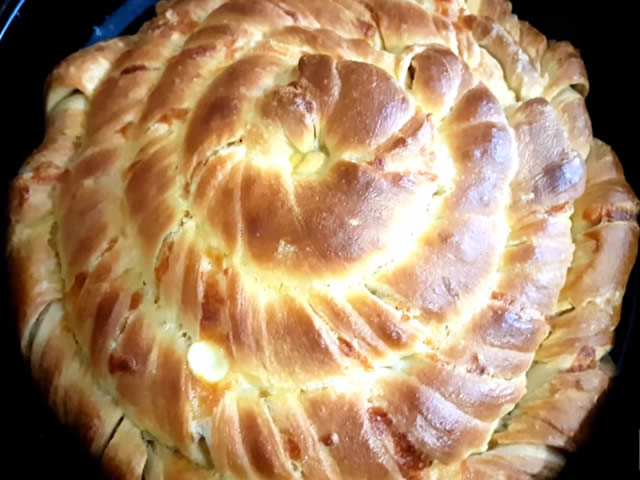 Sastojci: 700 g brašna, 2 ravne kašičice suvog kvasca, 1 kašika šećera, 230 ml mleka, kašičica soli, 3 jaja, 1 šoljica ulja (oko 100 ml), margarin za premazivanje- oko 50-70 g, 250 g kačkavalja, 1 jaje i kašičica mleka za premazivanje pogače.