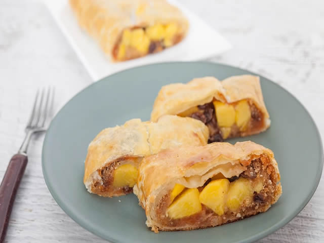 Sastojci: 1 blok lisnatog testa (250gr), 3 veće breskve, 50g suvog grožđa, 3 kašike šećera, 1 kašičica cimeta, 2 kašike soka od limuna, 1 kašika margarina, 6 kašika prezle, 3 kašike pekmeza od kajsija, 1dl voda, 1 jaje za premazivanje testa,
