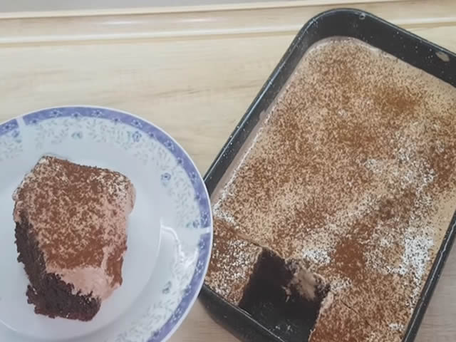 Sastojci: 250 g šećera, vanilin šećer, 250 g brašna, prašak za pecivo, ½ kašičice cimeta, 230 g maslaca ili margarina, 150 ml mleka, 5 kašika tamnog kakao praha, 1 kašičica kafe, čaša jogurta, 2 jaja, 2 kašičice ruma, 100g šlaga, 100ml vode, 2 table čokolade.