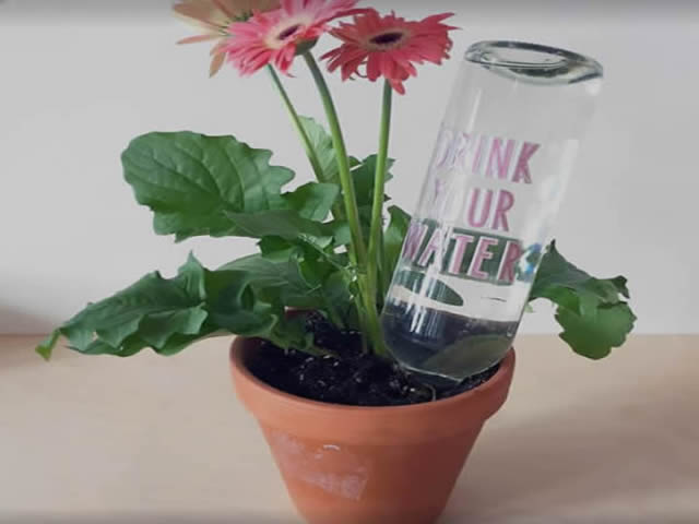 Sve što vam je potrebno jesu staklena boca, ekser i čekić.Ispraznite i dobro isperite staklenu bocu, zatim na čepu napravite jednu rupu pomoću eksera i čekića. Napunite bocu vodom u ubacite je u zemlju pored biljke (sa one strane na kojoj je čep). Ovako će biljka uzimati vode koliko joj je potrebno.Video uputstvo pogledajte u nastavku.