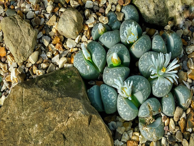 Tijelo ove biljke podsjeća na kamen. Sastoji se od dva lista preklopljena jedan preko drugog, koji se otvore u trenutku cvjetanja kako bi propustili dugi pupoljak na kojem se otvori žuti ili bijeli cvijet. Živa stijena raste u kamenitim područjima i teže ju je uočiti.