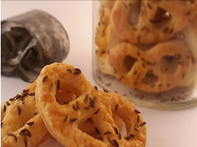 Razviti testo debljine pola do jedan centimetar, pa modlom vaditi perece. Ređati na pleh obložen papirom za pečenje. Premazati preostalom 1/4 umućenih jaja i posuti kimom.