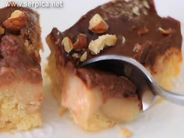 Prokuvajte slatku pavlaku, margarin, čokoladu i premažite preko kolača (vruća čokolada preko mlakog kolača). Pospite lešnicima i ostavite da se stegne pa isecite kocke ili šnite po želji. Prijatno.