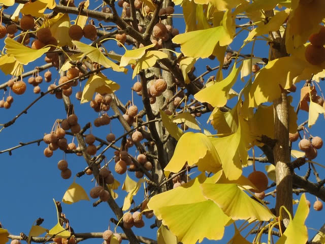 Muški cvetovi su na kratkim izdancima i imaju oblik rese sa puno prašnika. Na muškim biljkama se na vrhovima kratkih izdanaka obrazuju viseći klasići (cvasti). Ženski cvet ima dugu dršku na čijem se kraju nalaze dva semena zametka. Zrelo seme je slično koštunici, dugačko oko 3 cm. U pazuhu listova na kratkim izdancima ženskih biljaka obrazuju se semeni zameci. Seme je obavijeno mesnatim omotačem vrlo neprijatnog mirisa. (Zato se za drvorede i parkove koriste muške biljke.) Spoljašnji sloj semenjače je zapravo mesnat i neprijatnog mirisa kada je zreo, a unutrašnji sloj je tvrd.