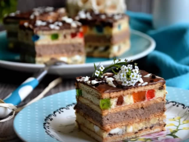Potrebno:1 kg keksa sa maslacem, 1 l mleka, 50 g kristal šećera, 3 pudinga ukusa vanila, 2 pudinga ukusa slatka pavlaka, 400 g maslaca, 200 g šećera u prahu, 15 čoko bananica, 200 g čokolade, 300 g žele bombona.