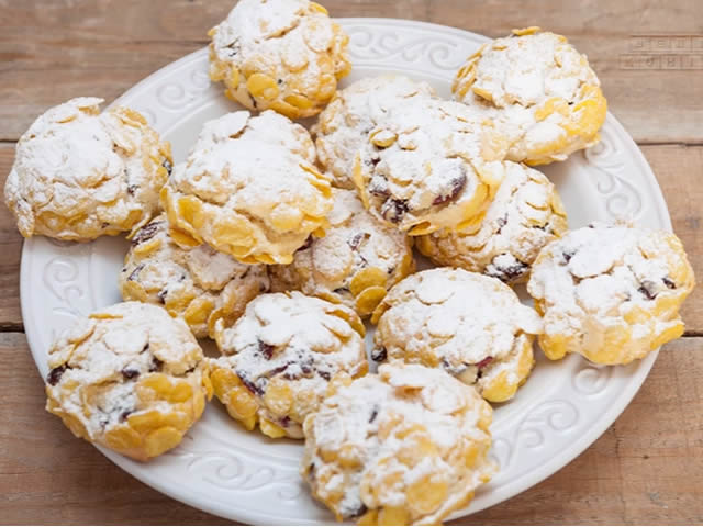 Sastojci: 2 jaja, 300g brašna, 100g šećera, 100g rastopljenog putera, 1 prašak za pecivo, 1 vanilin šećer, 130g brusnice, 100g corn flakes, šećer u prahu za posipanje.