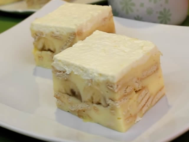 SASTOJCI: 3 vrećice praška za puding od vanilije, 9 žlica šećera, 1200 ml mlijeka, 300 grama petit beure keksa, 200 grama maslaca ili margarina + za podmazivanje protvana, 100 grama kiselog vrhnja, 4 banane, 300 ml vrhnja za šlag.