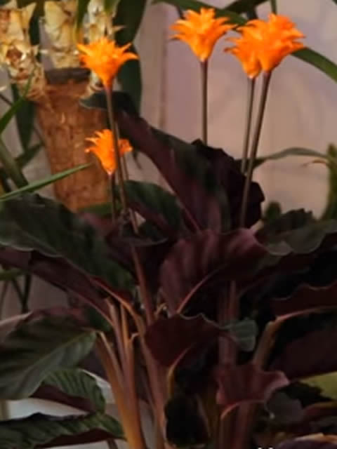 Vatrena kalateja raste u prirodnim uslovima u vlažnim šumama Južne Amerike. Jedina je kalateja koja se gaji zbog lepih cvetova. Listovi su dužine do 10 cm, sa naličja vino crvene boje. Listovi u osnovi obuhvataju cvetnu dršku. Na vrhu cvetne drške nalaze se brakteje narandžaste boje.