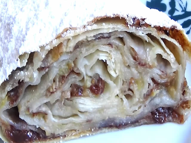 Sastojci za dve pitice: 2 gotove okrugle malo deblje kore 65cm precnik a moze bilo koje kore ako su tanje poduplajte i mazite spoj puterom, 5 banana, 2 sake suvog grozdja, 1 saka uvrsena ljesnjak przen krupno seckan, 1 saka cokoladni pahuljica, 120g puter istopljen, malo secera u prahu za posipati.