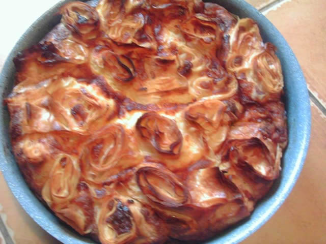 Rasposli se jedna kora na radni sto i poprska se ravnomerno sa malo sitnog sira. Preko ove se stavi druga kora i opet se poprska sa malo sitnog sira, pa treca i sve tako dok se kore i sir ne potrose. Znaci, sve kore jedna preko druge.