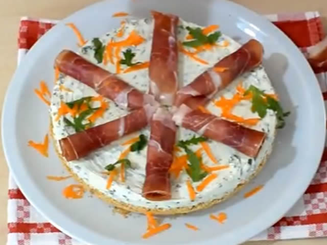 Sastojci:150 gr dvopekaM 100 gr maslaca, 1 žlica sezama, 300 gr svježeg mladog sira (ricotta), 300 gr kremastog sira (po izboru), 40 gr isjeckane rikule, sol po potrebi, papar po potrebi, 100 gr pršuta – šunke, mrkva za dekoraciju po potrebi.