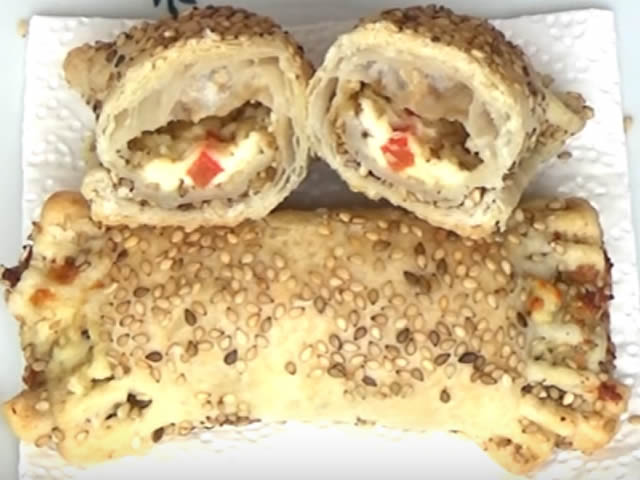 250g sira za pite slani, 250g kremast neslan neutralan sir, 50g rendanog sira za picu moze koji god volite, malo vise od pola paprike crvene, 120g susama od prilike za oba testa.