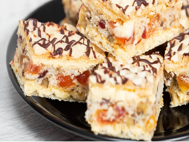 Sastojci: 2 lista oblatne, 150g + 120g šećera, 120g brašna, 1 prašak za pecivo, 7 jaja, 250g margarina, prstohvat soli, 100g pečenih i krupno seckanih oraha, 50g seckanih suvih kajsija, 50g suvih brusnica, 200g ratluka, 1 kesica vanilin šećera