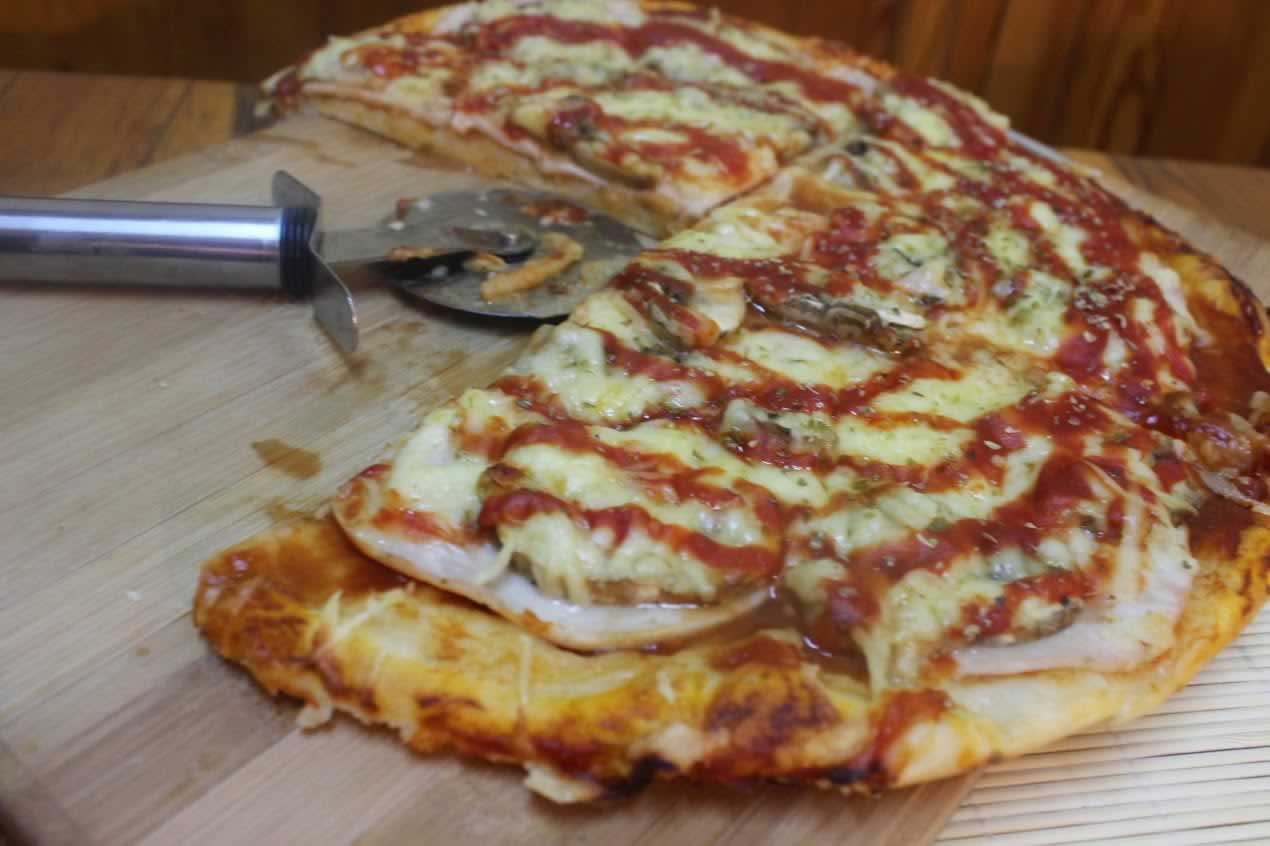 Naraslo testo premesite,podelite na tri manje loptice,svaku premesite razvucite oklagijom precnik tepsije.Prebacite testo u tespiju,premazite paradaiz pelatom,redjajte salamu,sampinjone i rendani sir.Odgore prelite sa malo kecapa i pospite origanom.