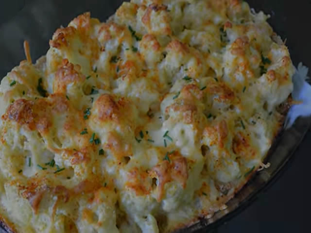 Svaki cvet karfiola zasecite kašikom kako bi preliv mogao svugde da dospe. Tako ćete dobiti pun ukus svakog zalogaja. (Znam da je lepše da cvetovi karfiola ostanu ucelo, ali je ovako daleko ukusnije!)