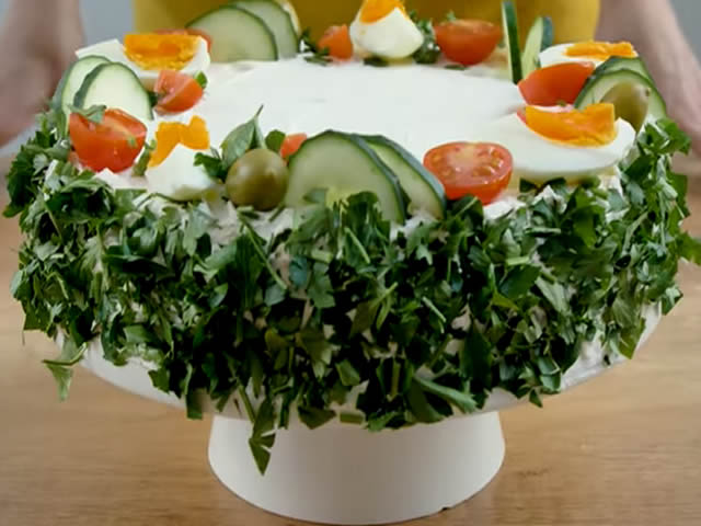 Premažite tortu krem sirom i odozgo dekorišite maslinama, seckanim krastavcem i jajima, i čeri paradajzom. Sa strane namažite krem sir i ukrasite sitno seckanim bosiljkom i peršunom.