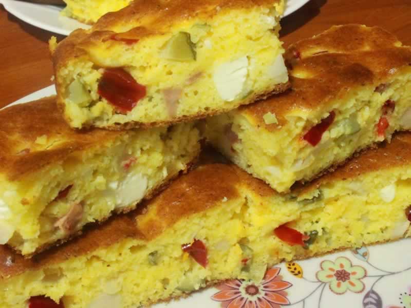 Umutite jaja, dodajte kukuruzno i belo brasno. Zatim jogurt, ulje. Izmesati dodati sir, iseckane krastavce i papriku.na kraju dodati prasak za pecivo i malo posoliti. Izliti u pleh oblozen papirom za pecenje i peci na 200 C oko 20 minuta. Pogledajte nacin pripreme u video snimku: