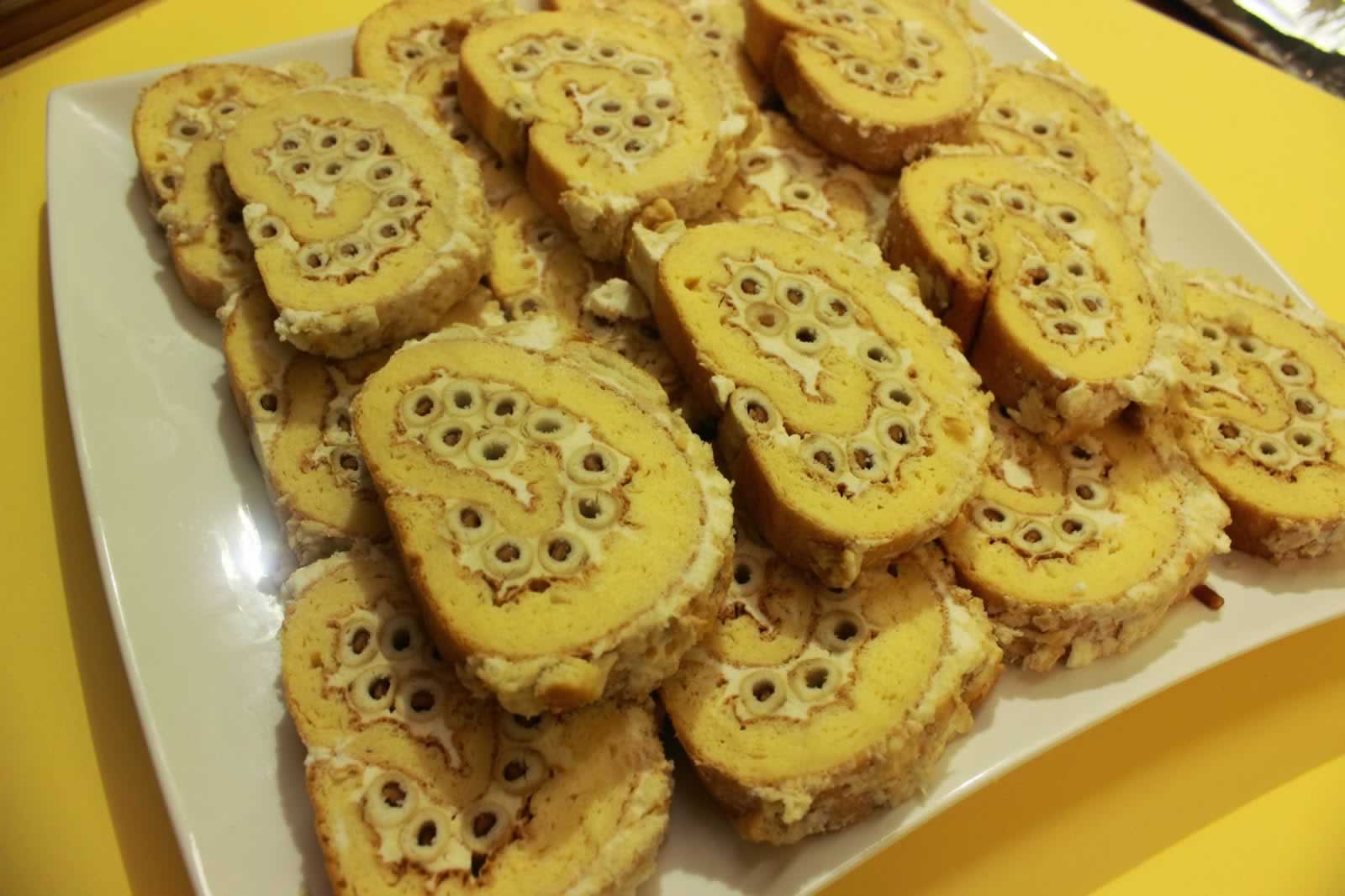 Odgore posuti sa prženim susamom ili mlevenim kikirikijem. Najlepše je sa susamom. Pogledajte u videu detaljno objašnjenje i način pripreme. Ostaviti jedan dan u frižideru da rolat lepo omekša pa tek onda seći. Prijatno!