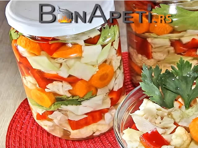 Potrebni sastojci: paprike – 1 kg crvene: kupus – 2 kg, šargarepa – 700 g, celer – 5 struka, karfiol – 1 – 2 glavice, šećer, so, sirće, aspirin