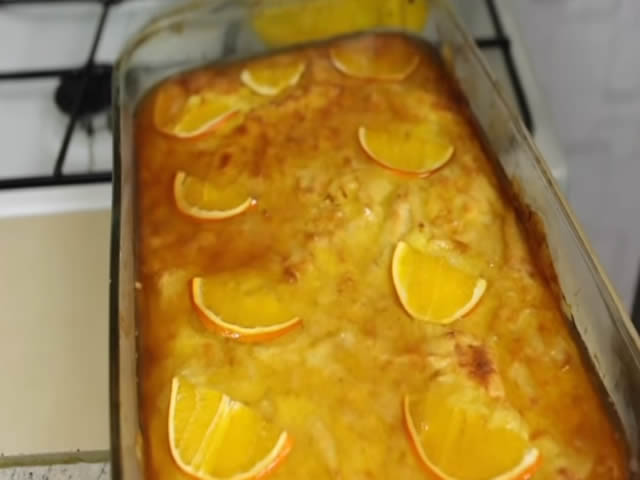 U ceđeni sok dodati jaja, šećer, jogurt i prašak za pecivo. Sjediniti sastojke mikserom i smesu preliti preko testa. Od gore poslagati isečene kriške pomorandže. Tepsiju staviti u zagrejanu rernu na 180 stepeni i peći oko 40 minuta.