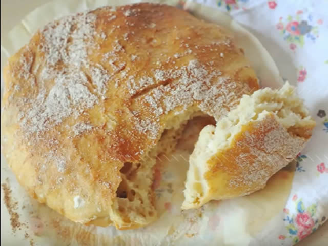 Ujutru zagrejte rernu zajedno sa posudom za pečenje na 230 stepeni. Testo prebacite na pobrašnjenu radnu površinu, pospite brašnom i u nekoliko poteza probajte da ga skupite kako bi ga prebacili na zagrejanu posudu za pečenje koju ste obložili papirom za pečenje. Testo je jako retko i lepljivo i nije lako za rad (vidite u videu).