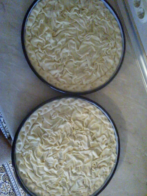 Drugi deo testa razvući malo više od veličine pleha za pečenje i prekriti pleh. Preko staviti fil od proprženog praziluka, sira i jaja, a odozgo razvučenu drugu koru. Iivice testa spojiti i formirati venčić . Preko pite naseckati malo margarina i peći na 180-200 stepeni.