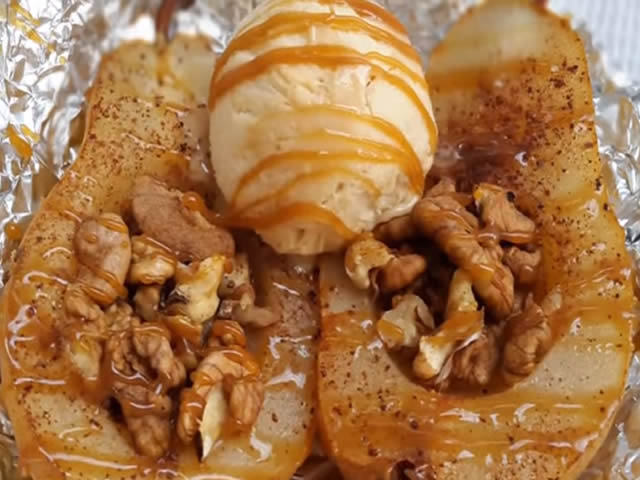 Kruške oprati, podeliti na pola i kašičicom izvaditi semenke. Odseći mali spoljašnji deo kruške kako bi mogla da stoji ravno na podlozi. Udubljenje u kom su bile koštice malo proširiti i dodati seckane orahe. Uviti posebno svaku polovinu u aluminijumsku foliju i staviti u rernu. Nakon 25 – 30 minuta otvoriti i viljuškom proveriti da li su kruške omekšale. Izvaditi iz rerne i ostaviti da se prohlade na 5 minuta.