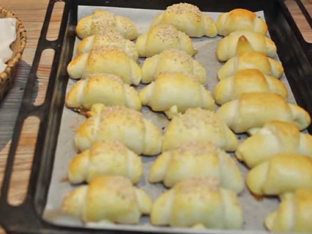 Razviti i iseći na 8 delova. Puniti viršlom, sirom ili ostaviti prazne. Na ovo testo staviti malo margarina i svaku kiflicu uviti. Premazati žumancetom, posuti susamom i peći dok ne porumene.