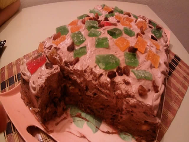 Potrebni sastojci: 800g cajnih kolutica, 1/2l cokoladnog mleka, 1l obicnog mleka, 4 kesice pudnga od cokoade, 2 kesice slag kreme od cokolade, 2 kesice slag kreme od cokolade (150g), 200g cokolade za kuvanje, 200g zele bombona, 100g suvog grozdja, 250g margarina, 200g secera u prahu.
