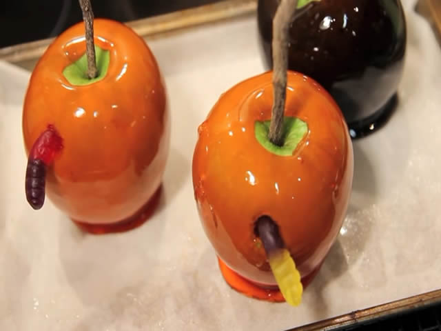 Umakati jabuke u dobijeni šećerni sirup i stavljati na pleh obložen pek papirom. Potrebno je više puta umočiti jabuke kako bi se dobila dovoljno debela glazura. Ukoliko više nije moguće umakati jabuke, treba ih preliti ostatkom šećernog sirupa.