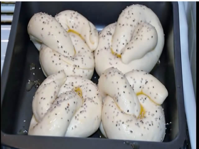 Kada smo tijesto razdijelili na jednake velicine oklagijom razvaljali lopticu za pletenicu i rolati duzinski da se dobije dugacka tanka rolna pa je premotati u cvor a krajeve previti paralelno. premazati rastopljenim margarinom i posuti sjemenakama maka ili susama.