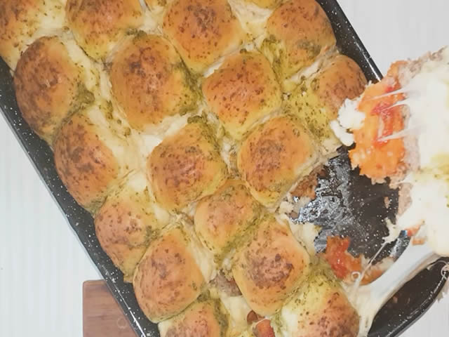 Sastojci za testo: 700g brašna, 80 ml ulja, 2 jaja, 1 kašika soli, 40g kvasca, 120 ml tople vode, 120 ml toplog mleka, 1 kašičica šećera, 800 g svinjskog mlevenog mesa, 1,5 glavica crnog luka,300g kačkavalja, kečap, ajvar, 3 kašičice pesto sosa.