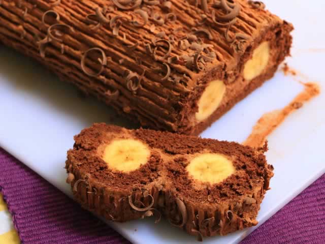Banane ogulite i izrežite vrhove, pa dve stavite na jedan kraj fila tj. piškote a druge dve na drugi kraj. Umotajte strane prema sredini. Dobro pritisnite da se rolat zalepi, premažite ostatkom fila i stavite u frižider da se stegne. Zatim išarajte viljuškom, pospite rendanom čokoladom ili po želji. Secite šnite i uživajte u odličnom ukusu. Prijatno!