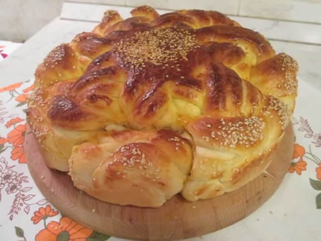 Prava dekoracija na stolu, domaća pletena pogača od ručno mesenog lisnatog testa.