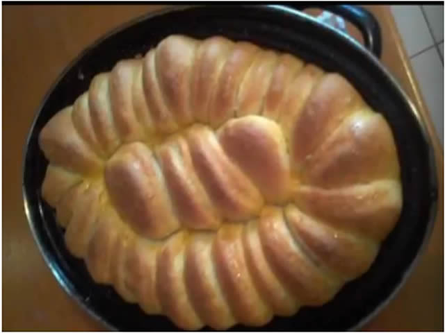 Kada se tijesto uduplalo,istresti ga na radnu površinu te razviti u malo veću jufku.Debljina tijesta treba da bude malo deblja od malog prsta. Čašom isjeci krugove te redati u malo veću šerpu. Svaki krug premazati sa rastopljenim margarinom. Kada ste poredali sve krugove,pokriti krpom i ostaviti oko 90min.da odstoji na sobnoj tem. Nadošlu pogaču premazati sa jajetom te peci na 200C 25 min.