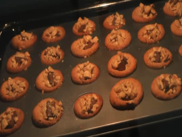 Umutite maslac, kikiriki puter, med. Dodajte jaje, cimet, brašno pa opet kratko umutite. Dodajte polovinu keksa, umutite pa opet ostatak keksa. Na kraju umešajte soda bikarbonu i od ove mase pravite male loptice. Kalup za male mafine namažite uljem ili puterom i u svaku rupicu stavljajte testo. Utisnite čepom za flaše i u svaku rupicu stavite komadić čokolade, kikiriki i pecite na 170 stepeni oko 25 minuta.