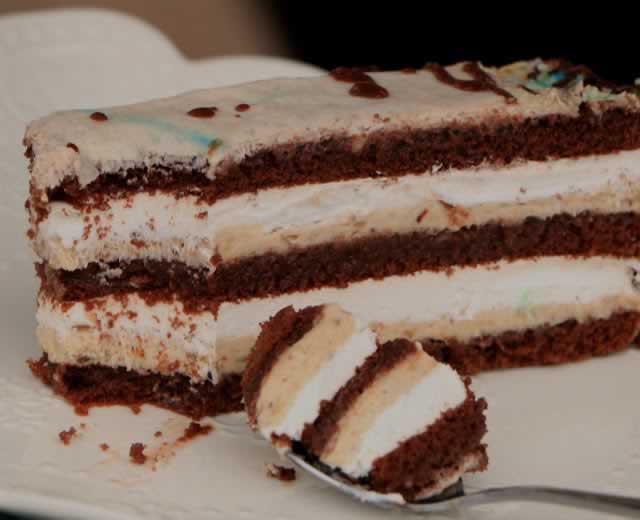 Izbockati koru čačkalicom da bolje upije čokoladno mleko. Natopiti koru sa dosta čokoladnog mleka, budite strpljivi dok ne upije. Premažite filom od lešnika pa zatim šlagom. Staviti drugu koru, izbockati, natopiti čoko mlekom…i tako do kraja. Treću tj. poslednju koru izbockati i natopiti čoko mlekom.