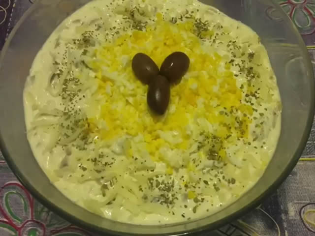 Sve sastojke lagano sjediniti. Dekorisite po zelji.Kackavalj,kuvano jaje,masline.