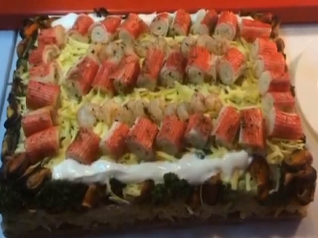 Kada smo sve spremili pristupamo slaganju i ostavimo da odstoji najbolje preko noci da se lepo sjedini.Secemo kocke i sluzimo uy casu dobrog belog suvog vina imamo kompletan obrok.Takodje mozemo seci male kocke i sluziti kao hladno predjelo.Prijatno!