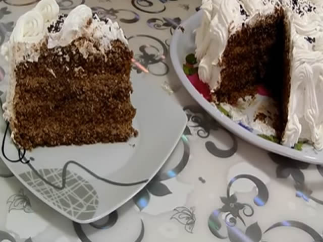 Ispečene biskvite vraćati ponovo u šerpu od 5kg.u kojoj je torta pečena i prelivati tečnim vrelim filom.Prelivenu tortu ostaviti da odstoji u frižideru najmanje 6sati.Zatim prevrnuti na tacnu i izfilovati sa 300gr.šlag kreme.