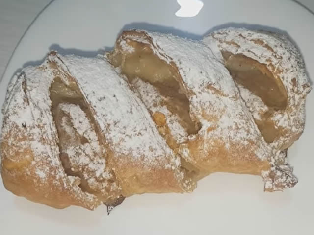KUJNA,TOP VESTI | January 14, 2019 izvor:Milica Mihailović Sastojci: Nekoliko jabuka malo cimet 3 – 4 kasike secera 1 jaje 1/2 solje mljeka 1/2 solje ulja 1 solja kisele vode 1/2 kilogram kore secer u prah Pripremu možete pogledati u VIDEU: Aromatična pastrmka Američka kupus salata