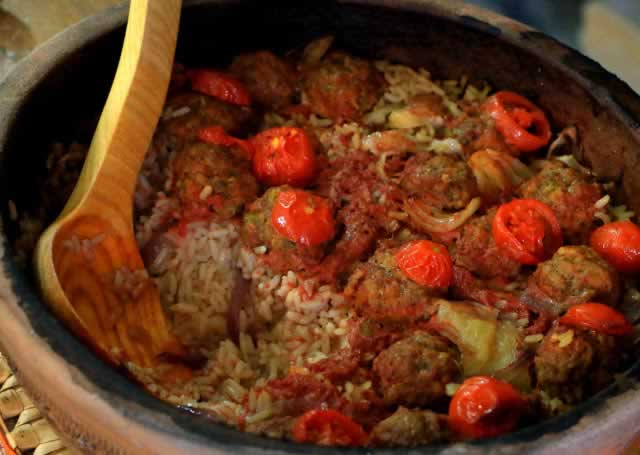 Crni luk isecite na rebarca, posolite, stavite začin i rukama ga izgnječite. Na dno tepsije ili pekača složite sav luk, prekrijte opranim pirinčem, prelijte paradajzom, vodom. Složite još i čufte i na kraju sve prelijte uljem. Ako imate, odozgo možete iseći kolutove paradajza. Pecite u saču, na žari oko 2 sata ili u rerni na 220 stepeni malo kraće. Jelo treba da upije tečnost, kada počne da peče ostavite oko 20 minuta i potom poslužite toplo. Prijatno i uživajte u odličnom ručku.