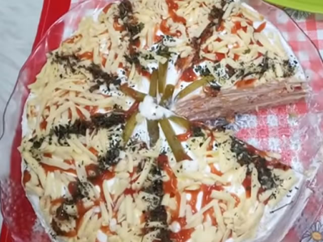 REDOSLED FILOVANJA: MAJONEZ KRASTAVCI, KEČAP-JAJA, PAVLAKA-ŠUNKARICA, KEČAP-KRASTAVCI, MAJONEZ-KAČKAVALJ, PAVLAKA-JAJA-KULEN, PAVLAKA-ŠUNKARICA-JAJA-KAČKAVALJ, STAVITI POSLEDNJI PALAČINAK I NAMAZATI CELU TORTU OSTATKOM PAVLAKE UKRASITI SA MALO KAČKAVALJA I KEČAPA.