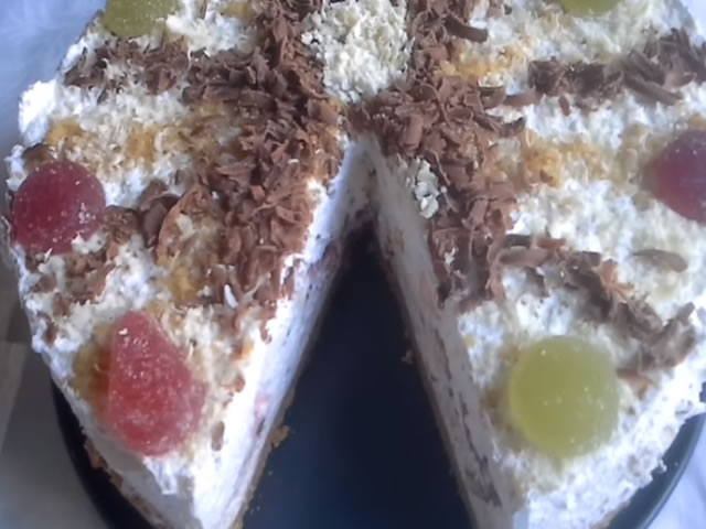 Kada stavite kremu sa napolitankama stavite je u zamrzivač na 30 minuta onda stavite kremu sa žele bonbonima pa u zamrzivač i stavite slag. Ukras prepuštam vašoj mašti i volji